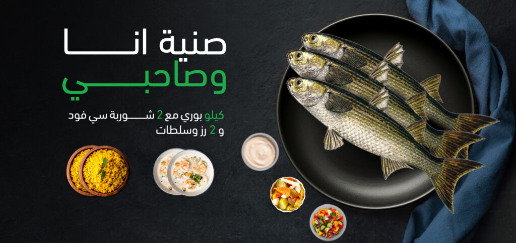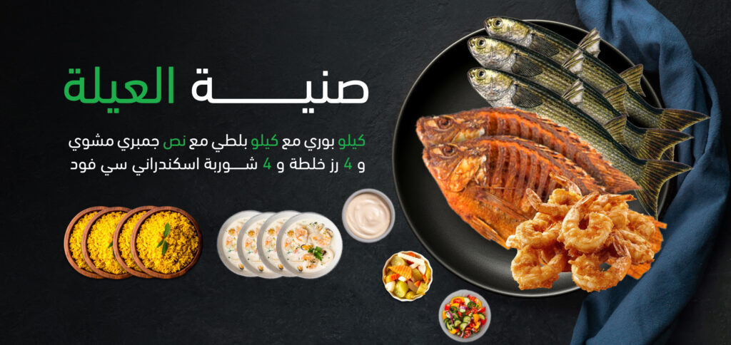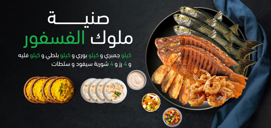 كيلو جمبري و كيلو بوري و كيلو بلطي و كيلو فليه و 4 رز و 4 شوربة سيفود و سلطات